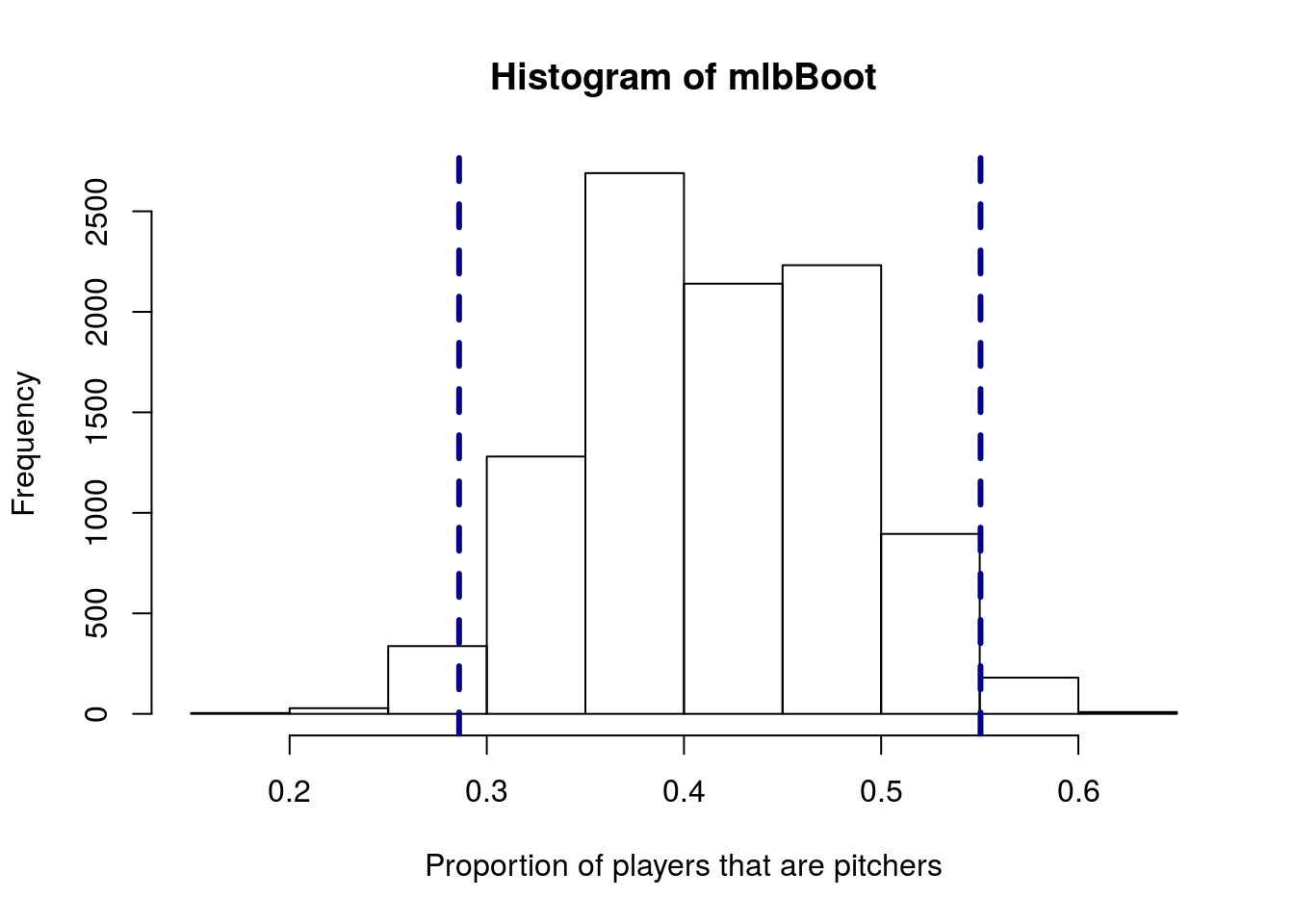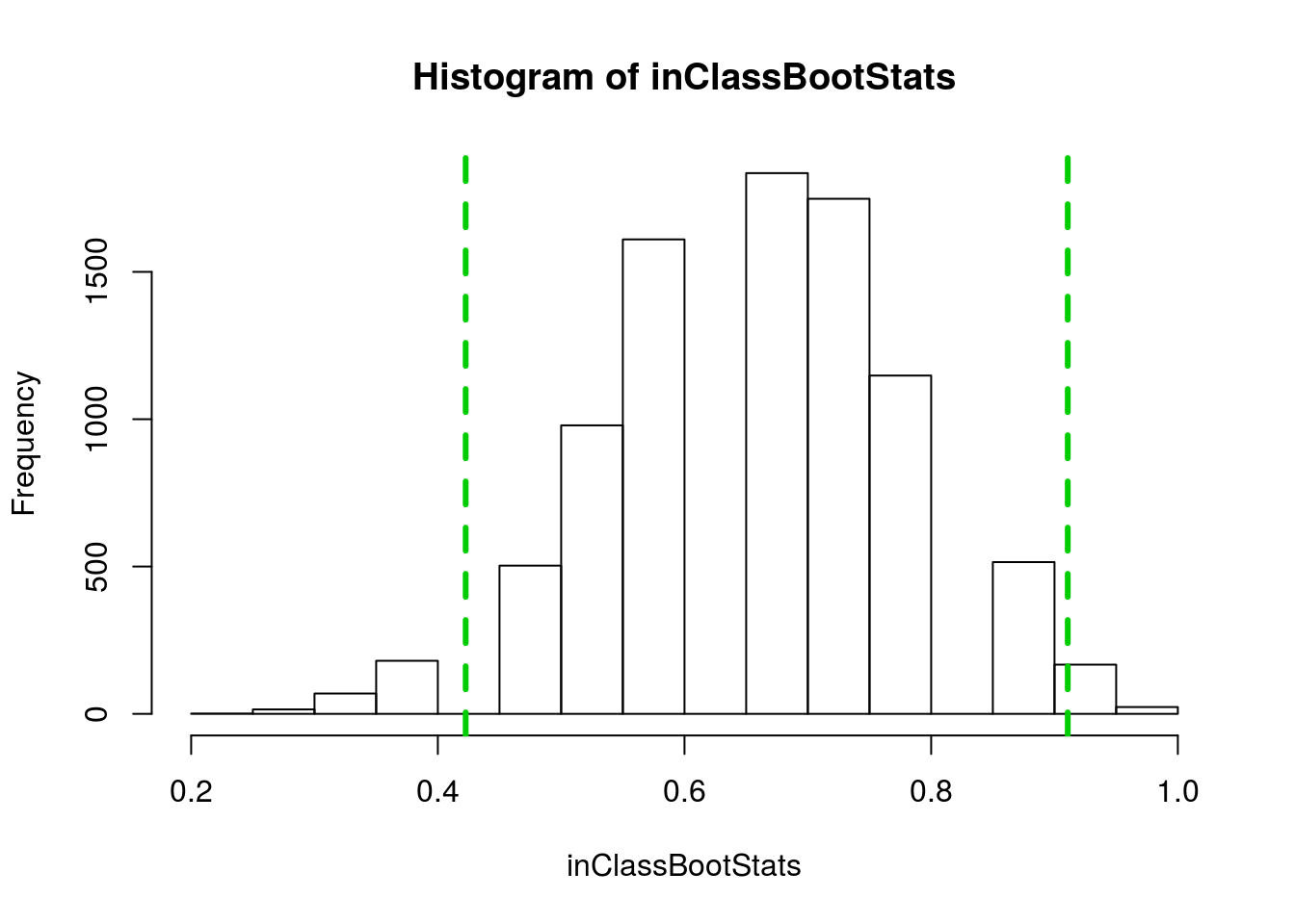 abline(v = propRedSample + c(-2,2)*sd(inClassBootStats),