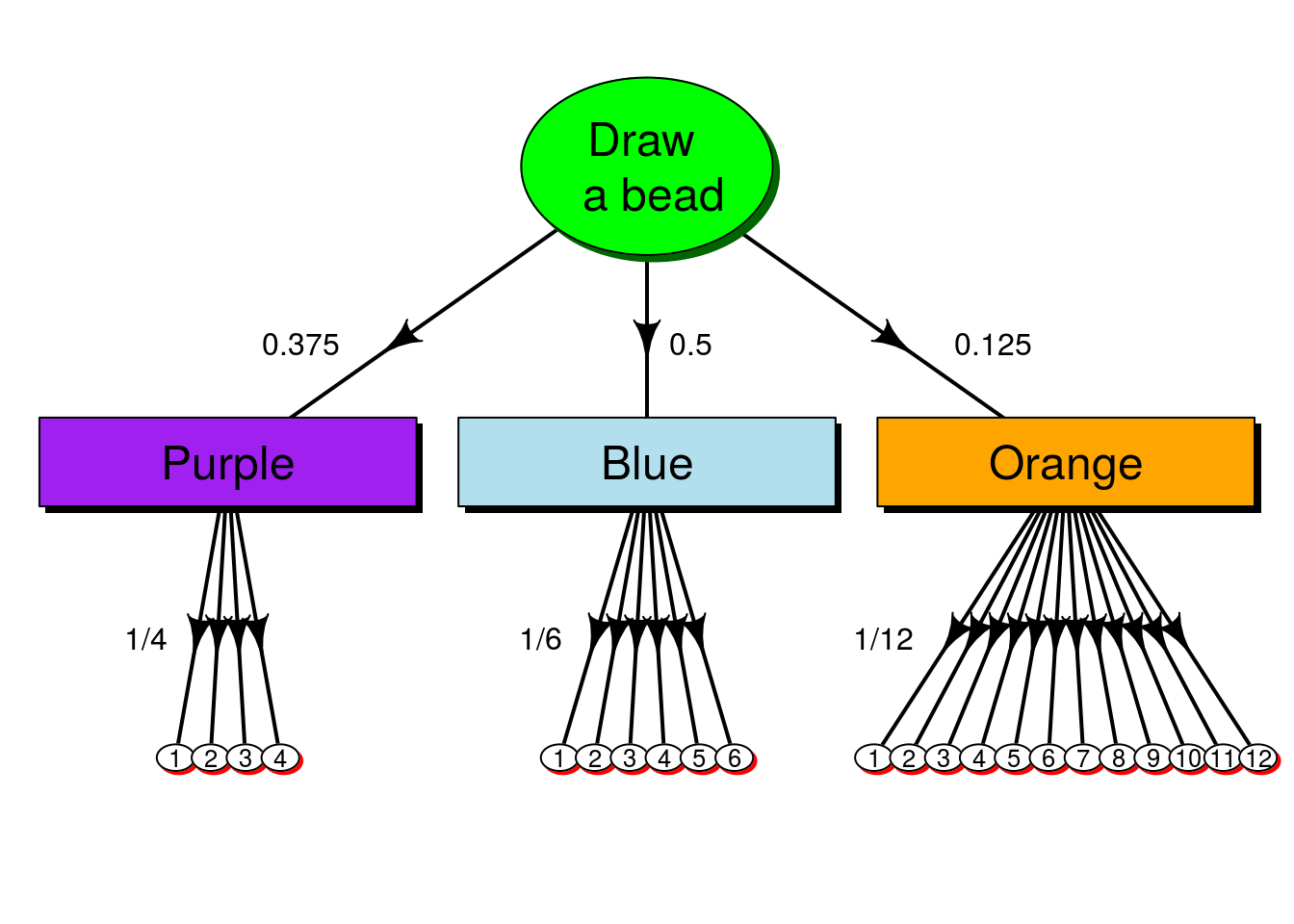 As an example, let’s build an example similar to the one we worked with in the last chapter. Just like with the beads and dice, we will draw a bead then roll a die. The difference this time is that, instead of always rolling a six-sided die, we will roll a different die based on the color of our bead. Specifically, we will roll the die that matches the color of the sampled bead: