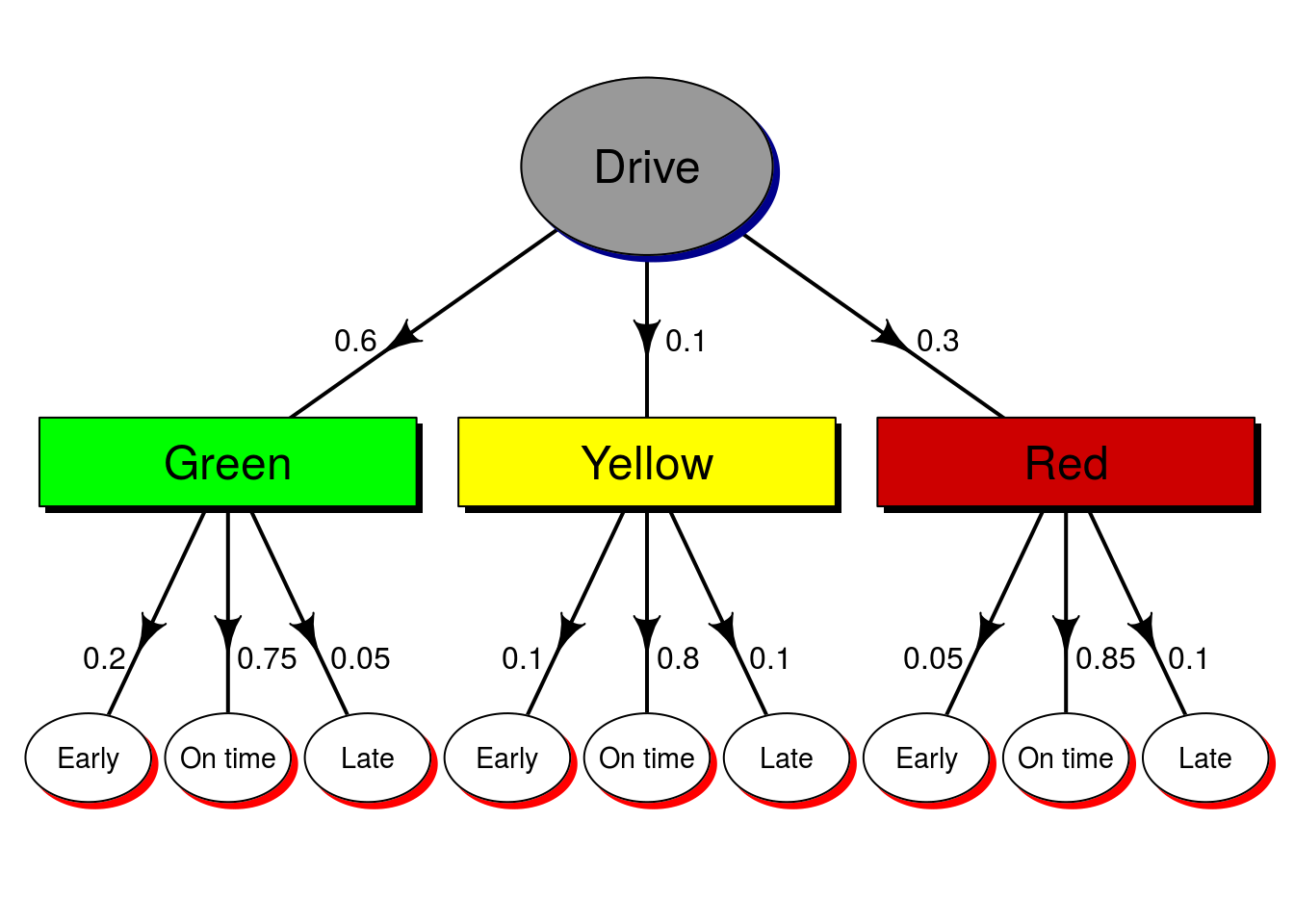 Now, we notice that those are just the numbers along the two sets of arrows leading to the “Late” bubbles. So, a simple heuristic to figure out the probability of an event from a tree diagram is to multiply the probabilities along the path to the final outcome. Here, we use: