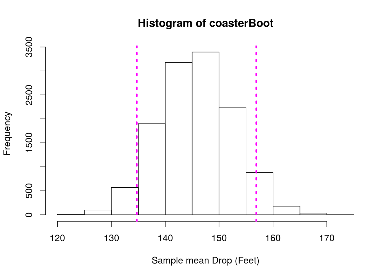 abline(v = quantile(coasterBoot, c(0.05, 0.95)),