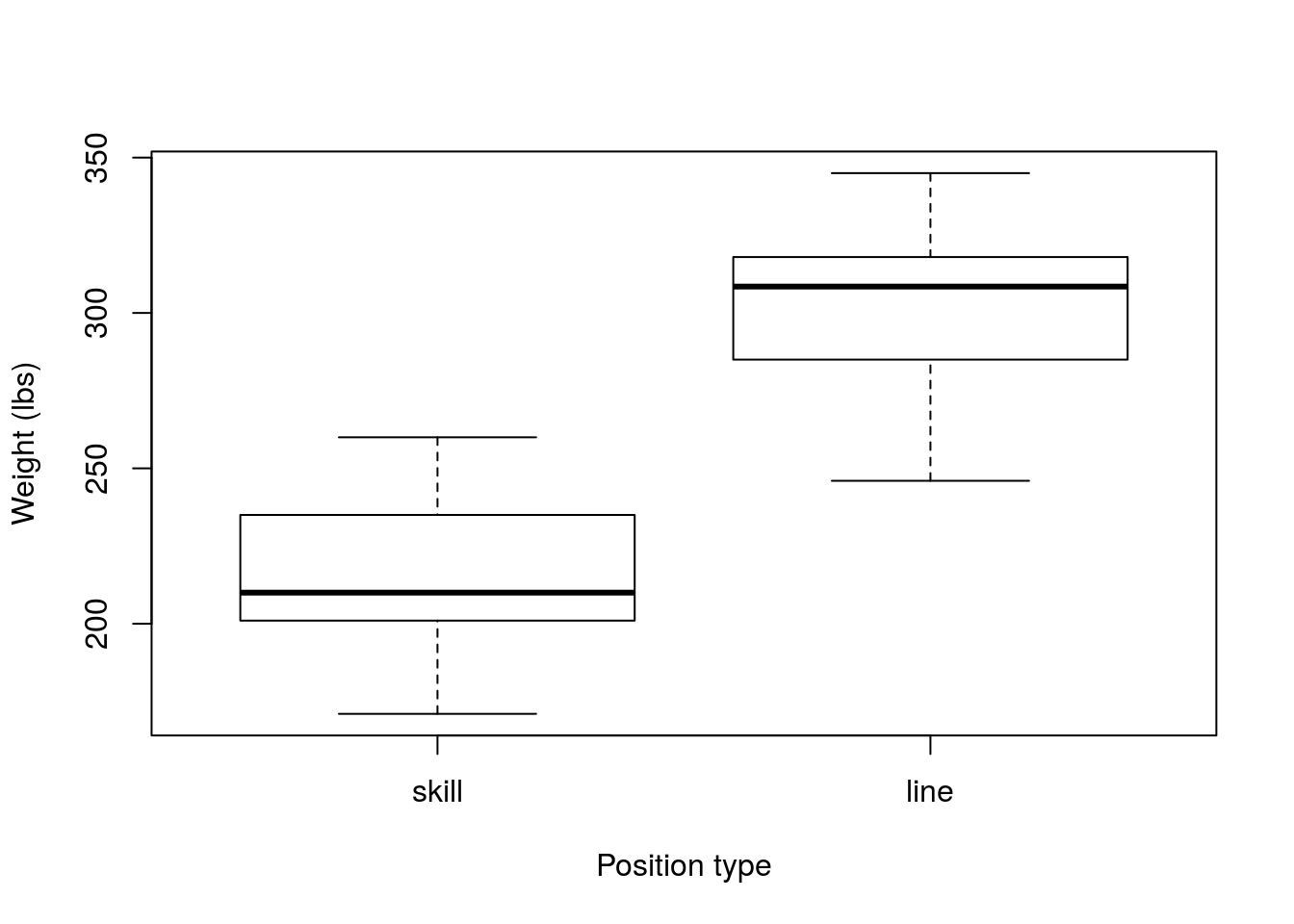 Returning the NFL data, what if, from a sample of the players that attended the combine, we wanted to estimate the difference in weight between linemen and skill players? Recall that we can use sampling and bootstrapping on just about any sample statistic we want, then let’s give it a try.