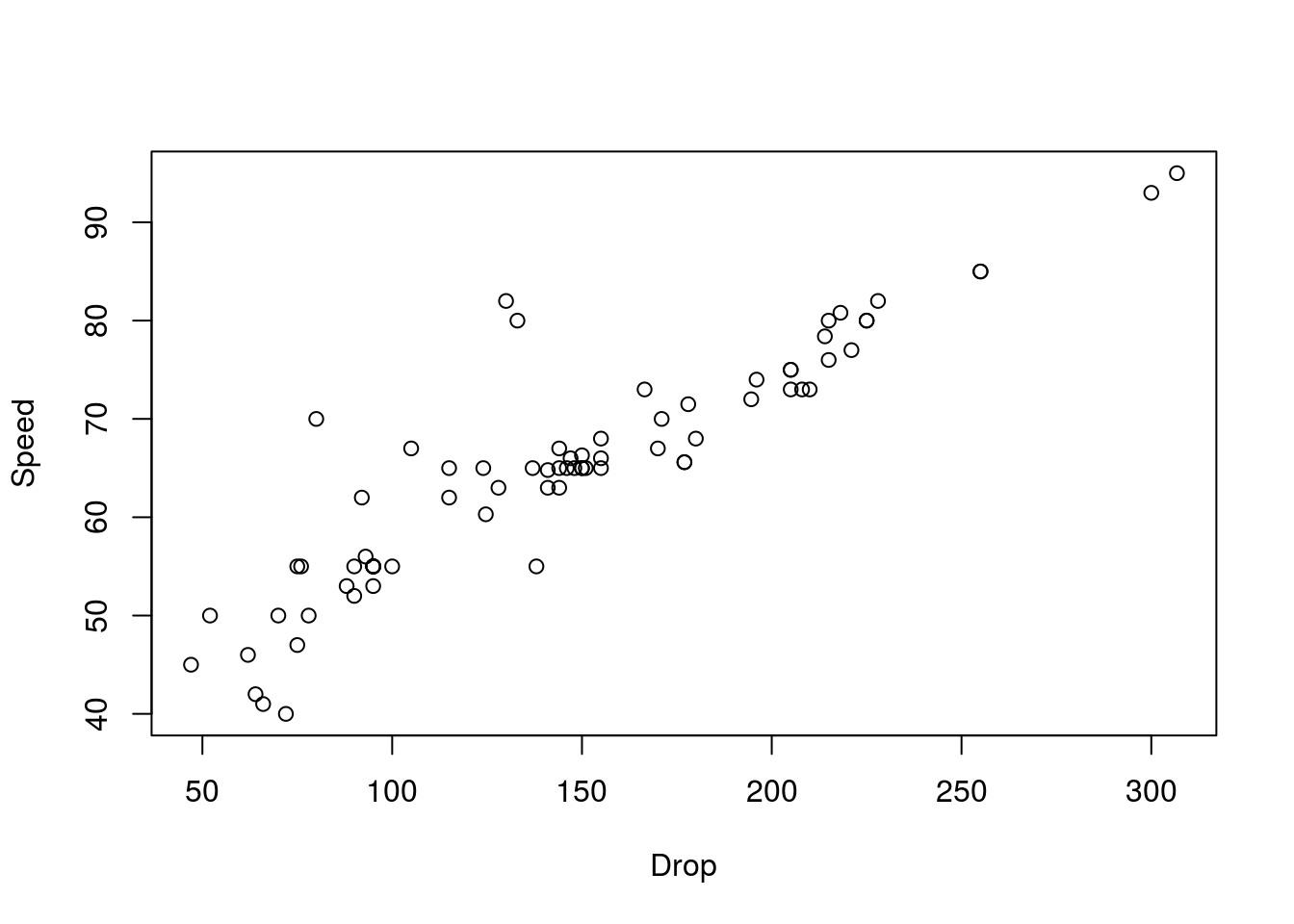 plot(Speed ~ Drop, data = rollerCoaster)