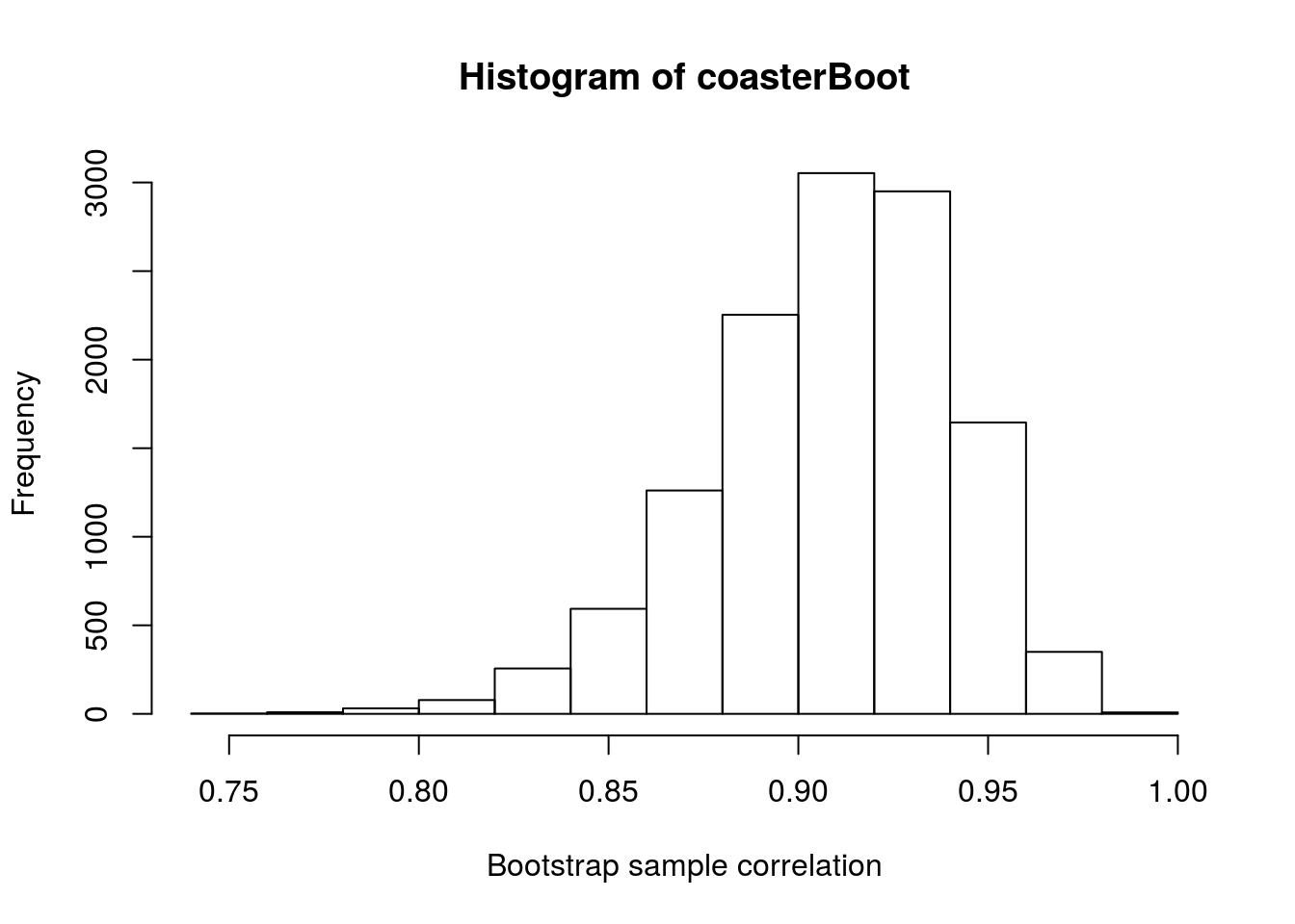 hist(coasterBoot, xlab = "Bootstrap sample correlation")